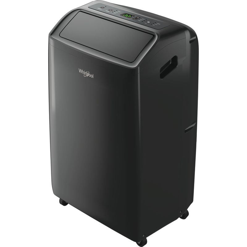 Cechy klimatyzatora Whirlpool: kolor czarny. Inteligentne kółka w celu łatwego przesuwania klimatyzacji w dowolne miejsce. Funkcja 6-ty Zmysł – czujnik temperatury automatycznie ocenia temperaturę w pomieszczeniu i stosuje idealne połączenie funkcji roboczych, w celu zapewnienia jak największego komfortu. Dzięki innowacyjnej funkcji Jet możliwe jest zmniejszenie temperatury o 5°C w zaledwie 10 minut. Funkcja Round U – czujnik zdalnego sterowania mierzy temperaturę w pomieszczeniu, w którym przebywa użytkownik i wysyła informację do urządzenia wewnętrznego, które reguluje chłodzenie w oparciu o tą informację, zapewniając optymalną temperaturę w całym pomieszczeniu.
