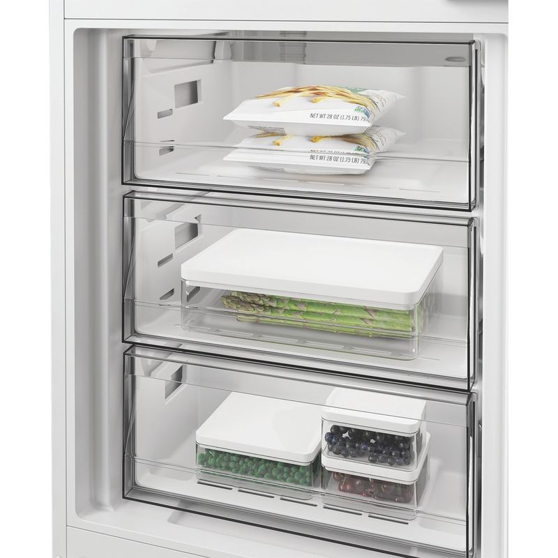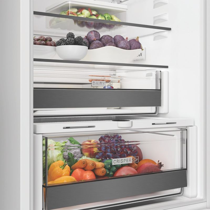 Cechy lodówki do zabudowy Whirlpool: szklane półki zapewniają wytrzymałość i elegancję. Wentylator zapewnia płynny i równomierny przepływ powietrza we wnętrzu urządzenia w celu zapewnienia udoskonalonej wentylacji. Czujniki 6-ty Zmysł automatycznie obniżają temperaturę w lodówce po włożeniu nowych produktów, zmniejszając zużycie energii. Praktyczna półka do bezpiecznego przechowywania butelek. Tryb wakacyjny zmniejsza zużycie energii podczas dłuższej nieobecności.