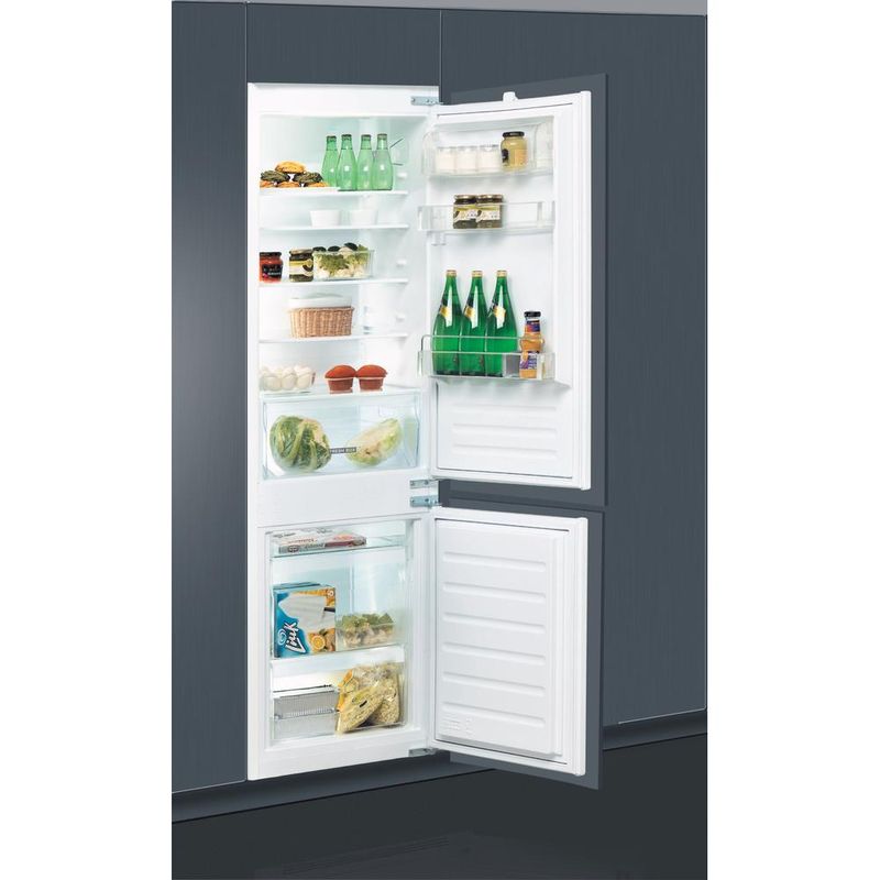 Cechy lodówko-zamrażarki do zabudowy Whirlpool: kolor biały. Szklane półki z profilami zapewniają wytrzymałość, elegancję i bezpieczeństwo. Czujniki 6-ty Zmysł automatycznie obniżają temperaturę w lodówce po włożeniu nowych produktów, zmniejszając zużycie energii. Praktyczna półka do bezpiecznego przechowywania butelek.