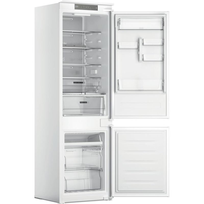 Cechy lodówki do zabudowy Whirlpool: kolor biały. Szklane półki zapewniają wytrzymałość i elegancję. Wentylator zapewnia płynny i równomierny przepływ powietrza we wnętrzu urządzenia w celu zapewnienia udoskonalonej wentylacji. Czujniki 6-ty Zmysł automatycznie obniżają temperaturę w lodówce po włożeniu nowych produktów, zmniejszając zużycie energii. Praktyczna półka do bezpiecznego przechowywania butelek.